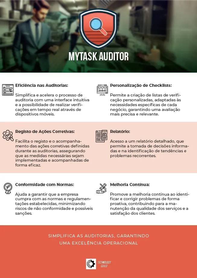 O MyTask Auditor é um software especializado na realização de auditorias internas ou externas, pois otimiza a avaliação e o controlo dos processos operacionais e de conformidade com apoio de AI. Funciona através de um interface intuitivo que permite aos auditores registar e gerir informações em tempo real. A eficácia da auditoria depende da qualidade da informação recolhida. Por causa de exigências normativas e operacionais, o sistema foi desenhado para garantir rastreabilidade e fiabilidade em todas as etapas.