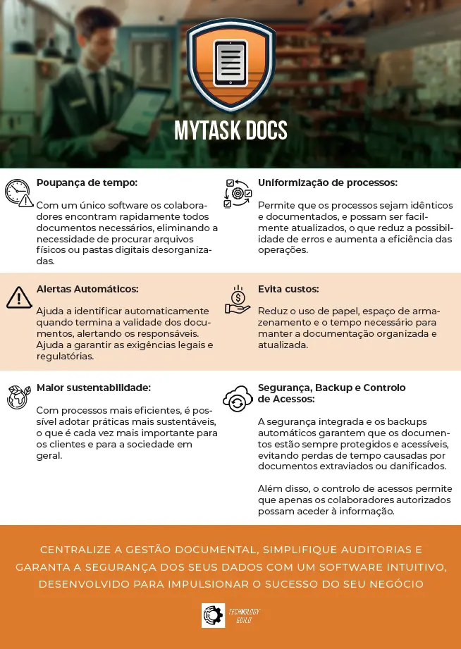 A segurança integrada e os backups automáticos garantem que os documentos estão sempre protegidos e acessíveis, evitando perdas de tempo causadas por documentos extraviados ou danificados. Além disso, o controlo de acessos permite que apenas os colaboradores autorizados possam aceder à informação.