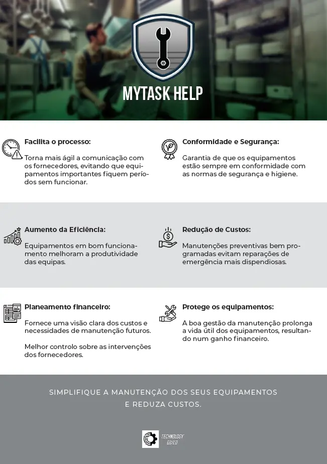O MyTask Help é um software de gestão de manutenção de equipamentos para restaurantes, pois permite controlar, programar e realizar manutenções com maior eficiência com apoio de AI. Por causa de falhas inesperadas e exigências operacionais, é essencial garantir a manutenção regular de todos os equipamentos do estabelecimento.
