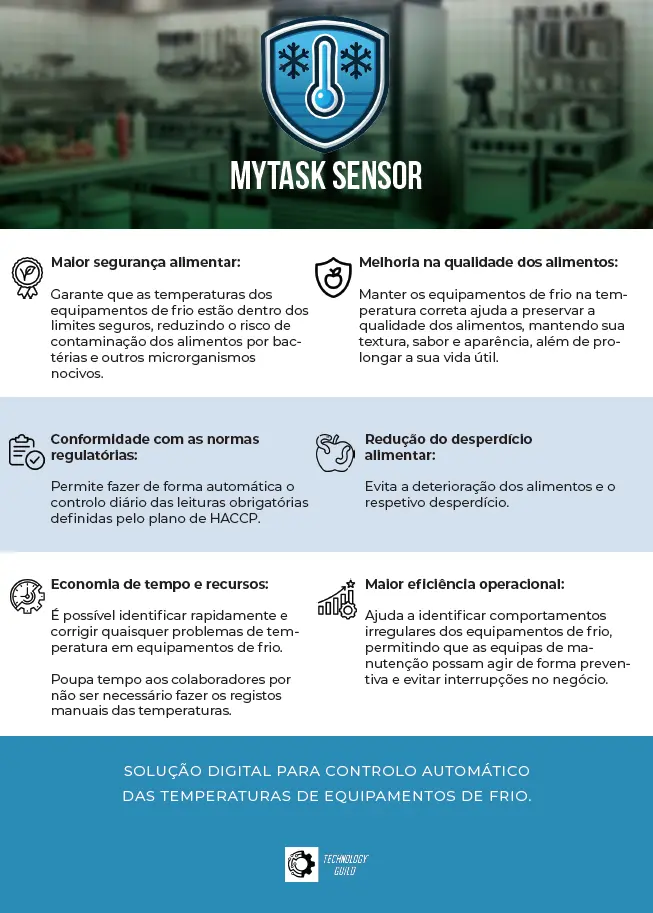 Permite fazer o controlo remoto e contínuo das temperaturas dos equipamentos de refrigeração e congelação, pois está sempre ativo e ligado ao sistema com apoio de AI. Por causa de exigências legais e de segurança alimentar, é possível extrair os relatórios de registos de temperatura do plano de HACCP. Contudo, é essencial garantir que os sensores estão corretamente instalados e calibrados para fiabilidade dos dados.